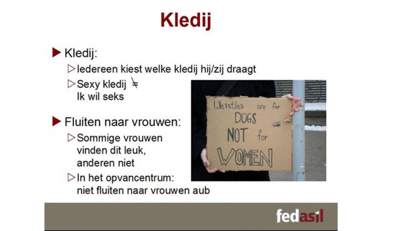 "Wat voor associaties krijg je bij dit plaatje?", vraagt de Noorse cursusleidster Linda Hagen, die voor een groep Syrische vluchtelingen staat. Afgebeeld is een vrouw op een bank in een zwart jurkje, hoge hakken, de benen licht gespreid.
