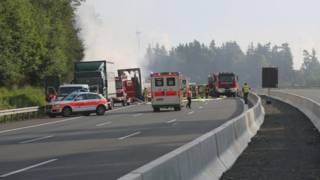 In Duitsland zijn door een aanrijding tussen een bus en een vrachtwagen achttien mensen om het leven gekomen. Ze zaten in de touringcar waarvan alleen een verkoold wrak over is.