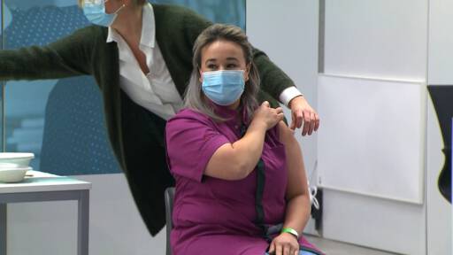 Zorgmedewerker Sanna Elkadiri is de eerste Nederlander die het vaccin toegediend krijgt.