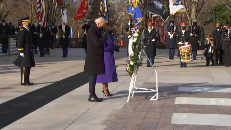 Als eerste daad van zijn presidentschap heeft Joe Biden de militairen geëerd die bij conflicten gevallen zijn. Bij de Tombe van de Onbekende Soldaten op de begraafplaats Arlington legde hij met vicepresident Harris een krans, in aanwezigheid van zijn voorgangers Obama, Bush en Clinton met hun vrouwen. Biden sloeg een kruisteken toen hij het bloemstuk plaatste, daarna salueerde hij toen de Last Post werd geblazen.