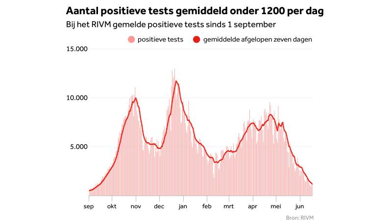- Gemiddeld aantal nieuwe besmettingen daalt verder, 13 miljoen prikken gezet;