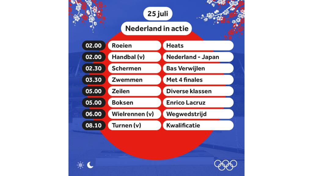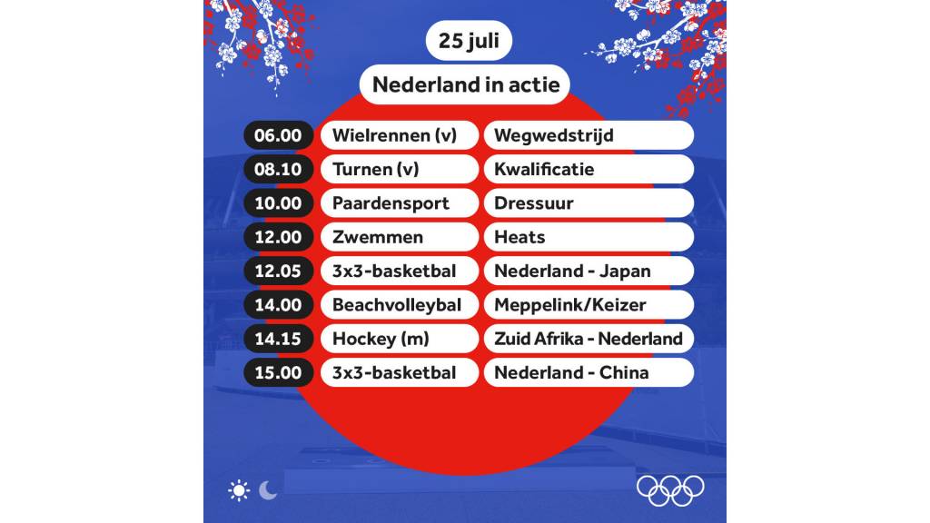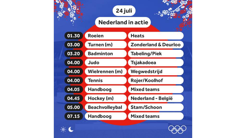 Komende nacht barst de strijd los, met diverse Nederlandse toppers die in actie komen. De beide hockeyteams beginnen, Epke Zonderland komt in actie op de rekstok en de wielrenners gaan de weg op. Bekijk hier het 'Nederlandse' programma van de komende dagen: